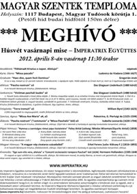 2012. április 8. 11:30 (vasárnap) - Magyar Szentek Temploma, 1117 Budapest, Magyar Tudósok körútja 1. (Petőfi híd budai hídfőtől délre 150m)