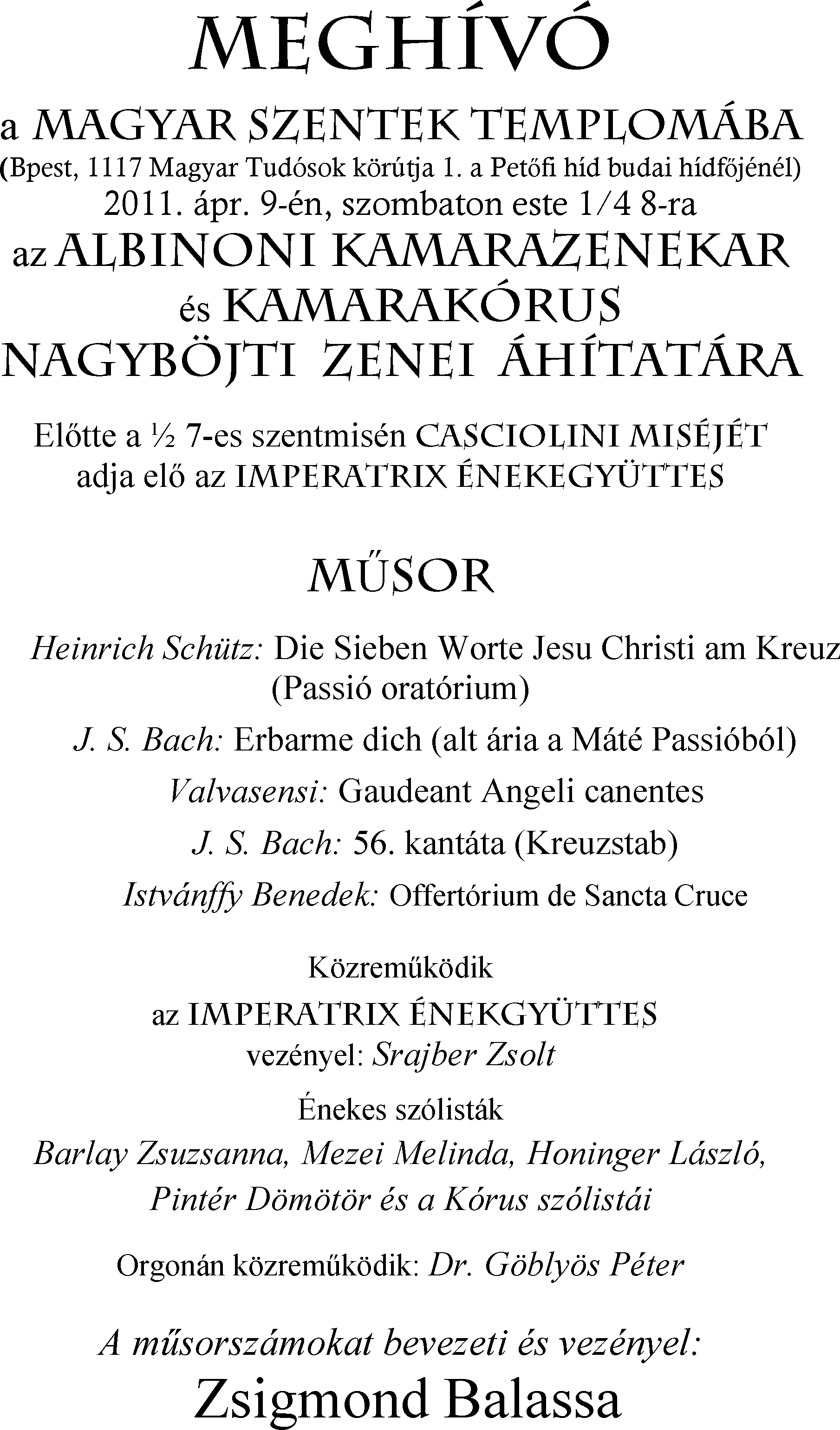 2010. április 9. 18:30 (szombat) - Magyar Szentek Temploma, 1117 Budapest, Magyar Tudósok körútja 1. (Petőfi híd budai hídfőtől délre 150m)