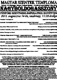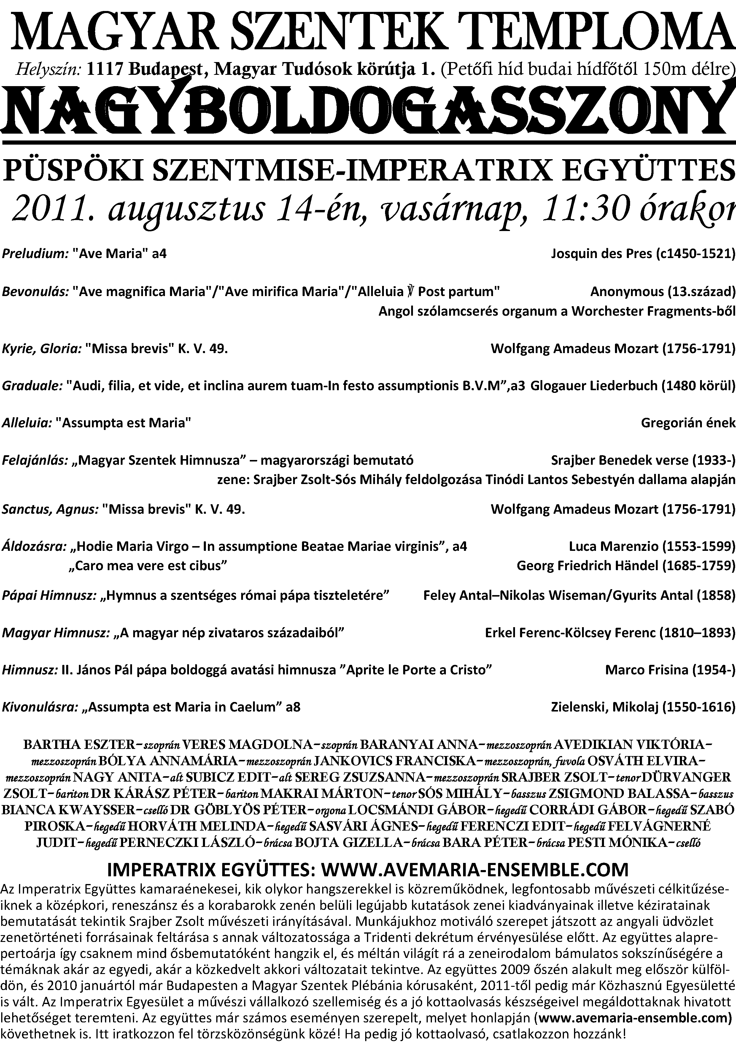 2011. augusztus 14. 11:30 (vasárnap) - Magyar Szentek Temploma, 1117 Budapest, Magyar Tudósok körútja 1. (Petőfi híd budai hídfőtől délre 150m)