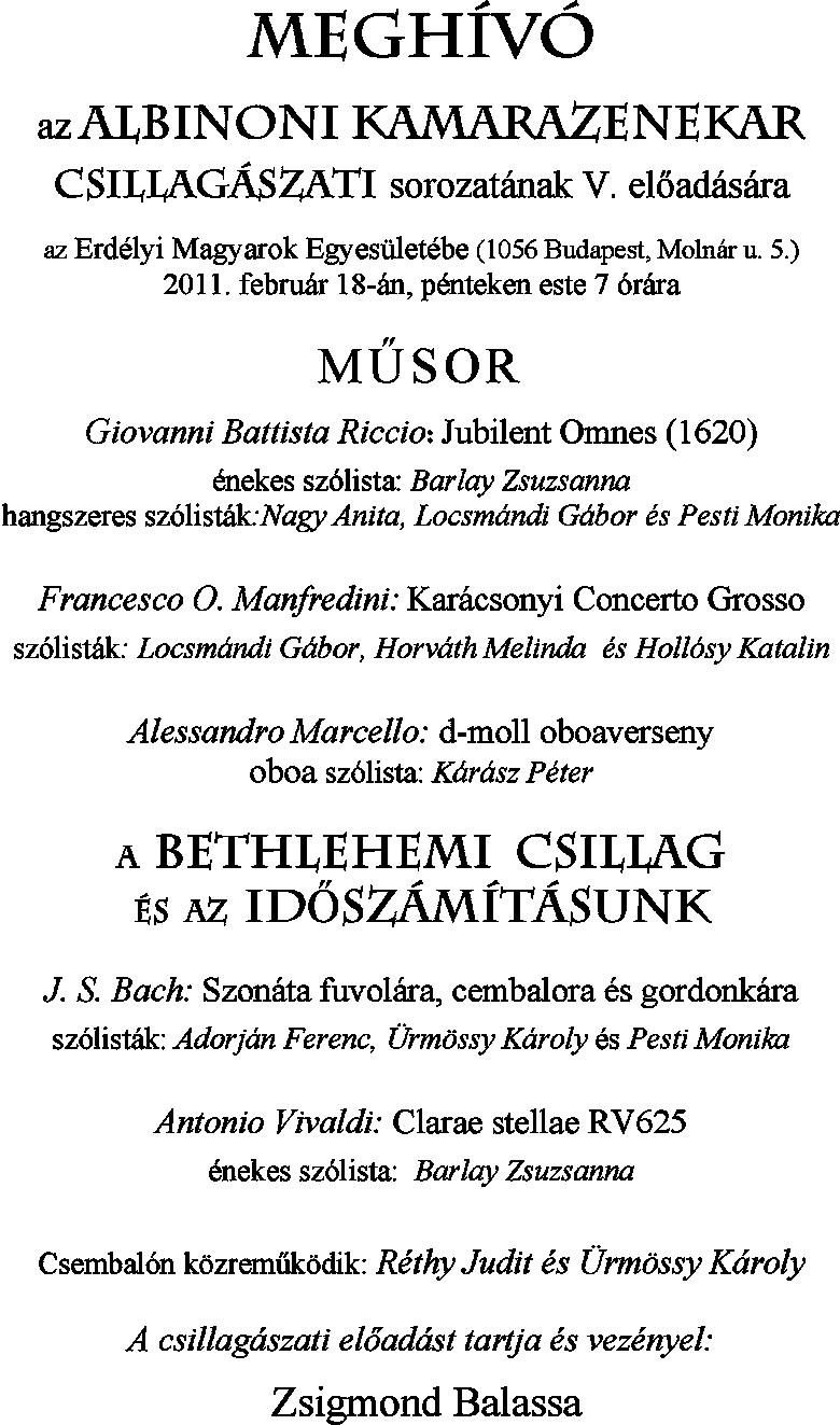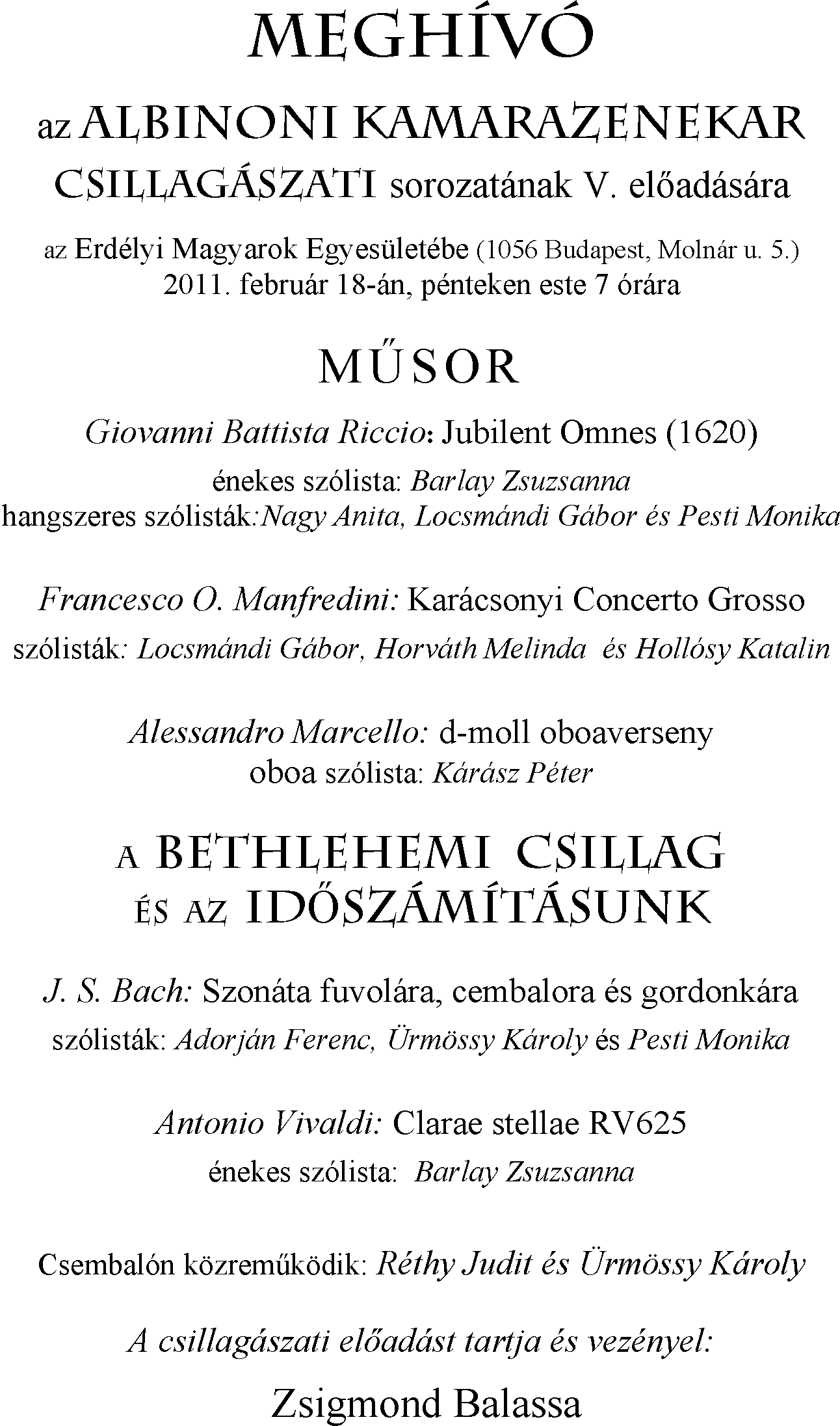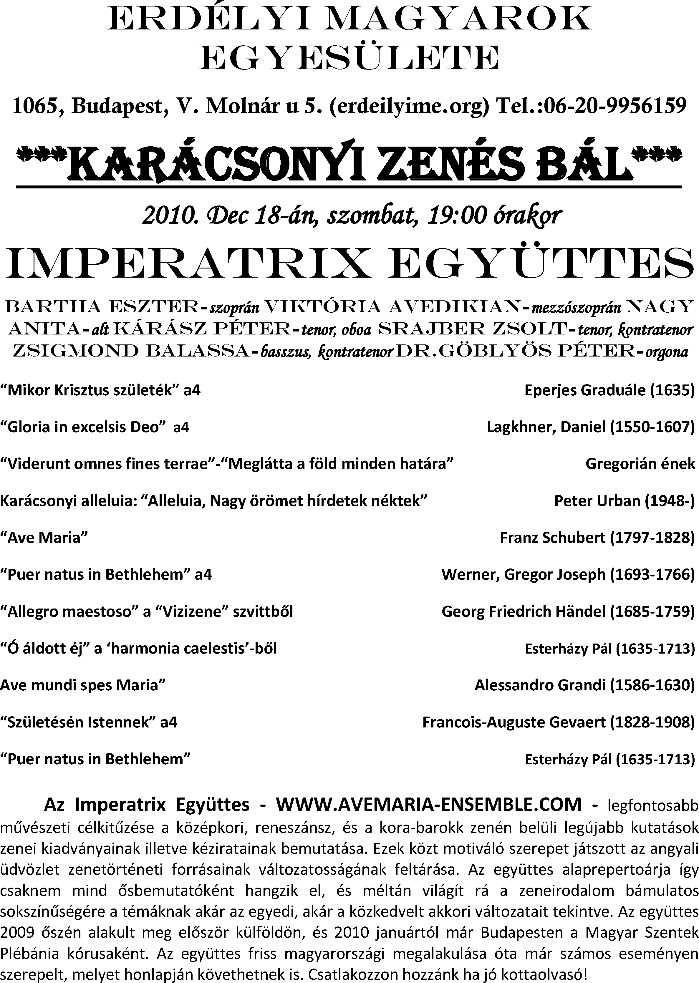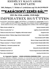 2010. december 18. 19:00 (szombat) - Erdélyi Magyarok Egyesülete, 1056 Budapest, Molnár utca 5. (Tel. 36-20-9956159, www.erdelyime.org)