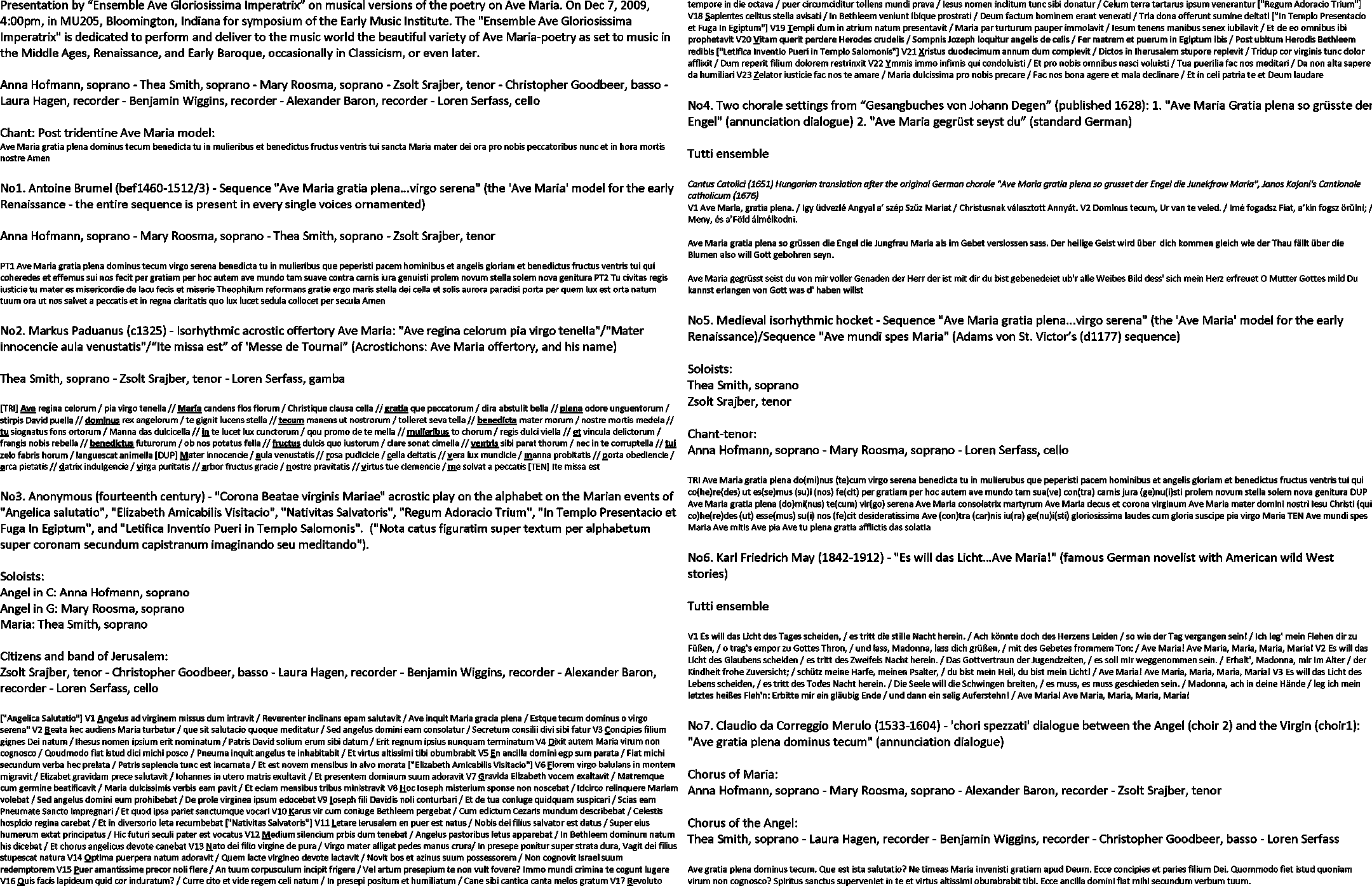 Class presentation of "Ensemble Ave Gloriosissima Imperatrix" for the Early Music Department, Bloomington, IN, USA.