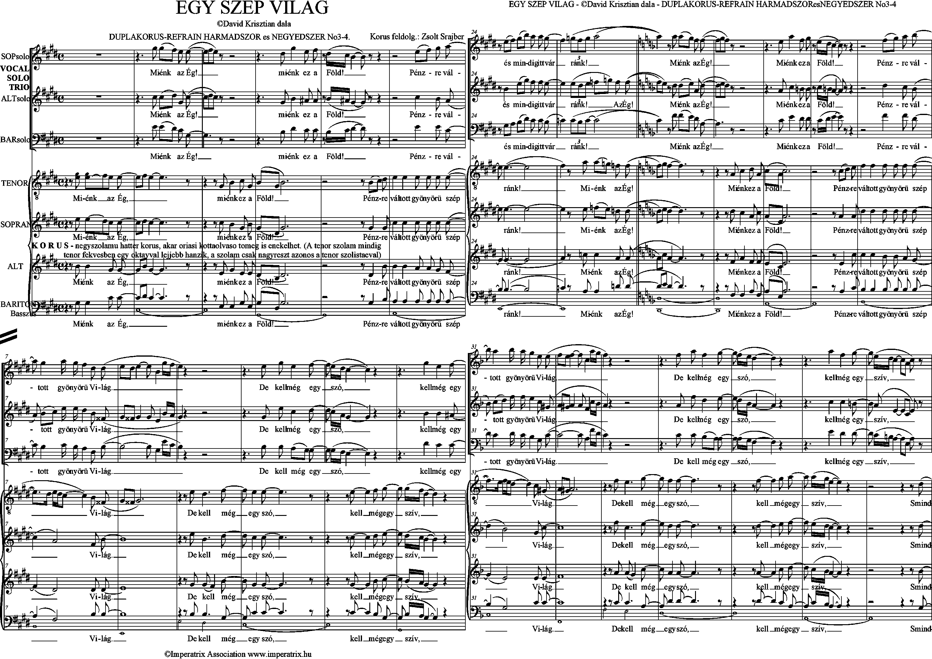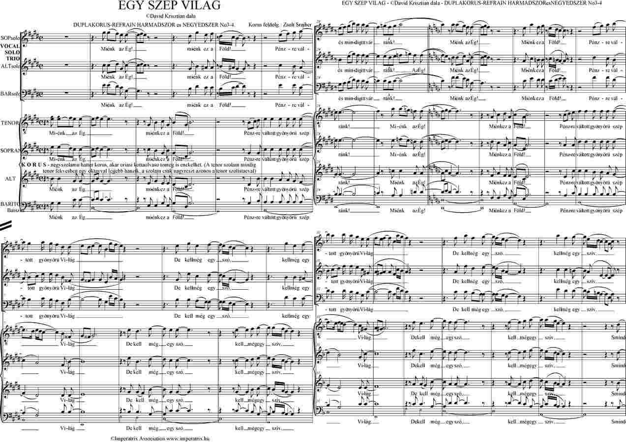 Film recording of the song “Egy szép világ” (“Our loveliest incorruptible Earth”) by Krisztián Dávid (Chris Dave) arranged by Zsolt Srajber for 3 soloists and 4 part mixed choir. A joint production of Imperatrix Ensemble and the Assosiation of Hungarian Artist Entrepreneurs.