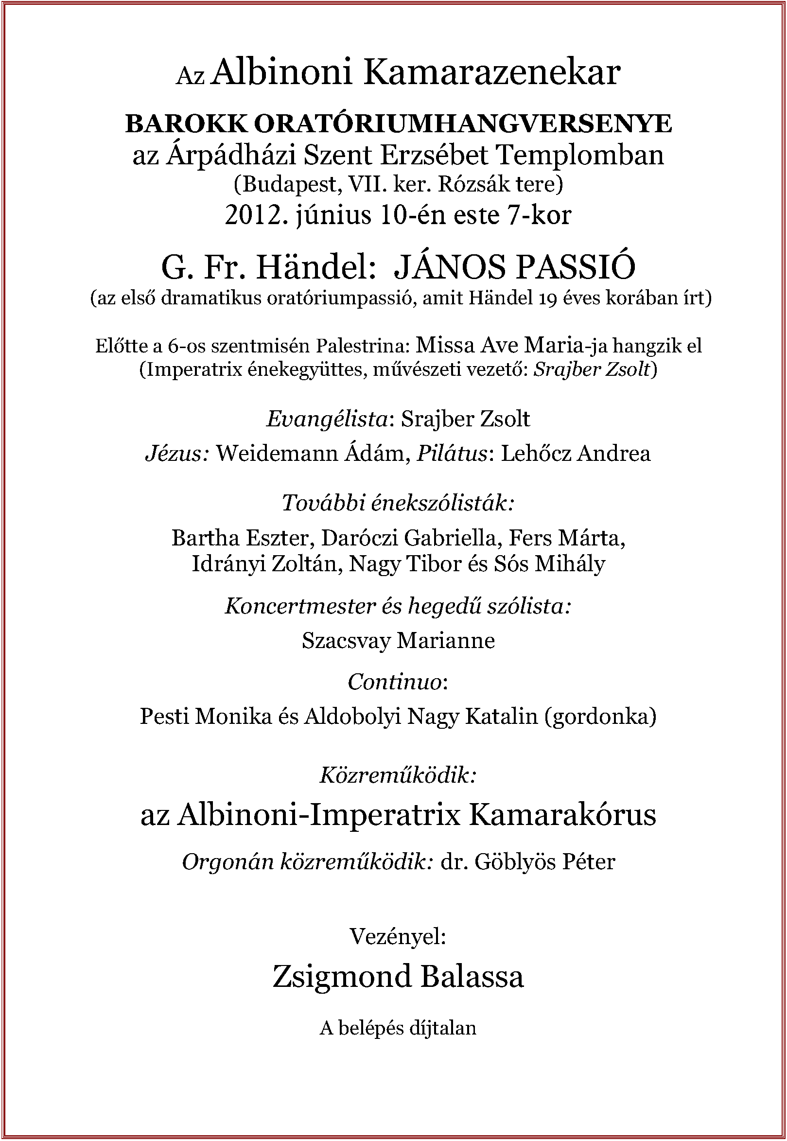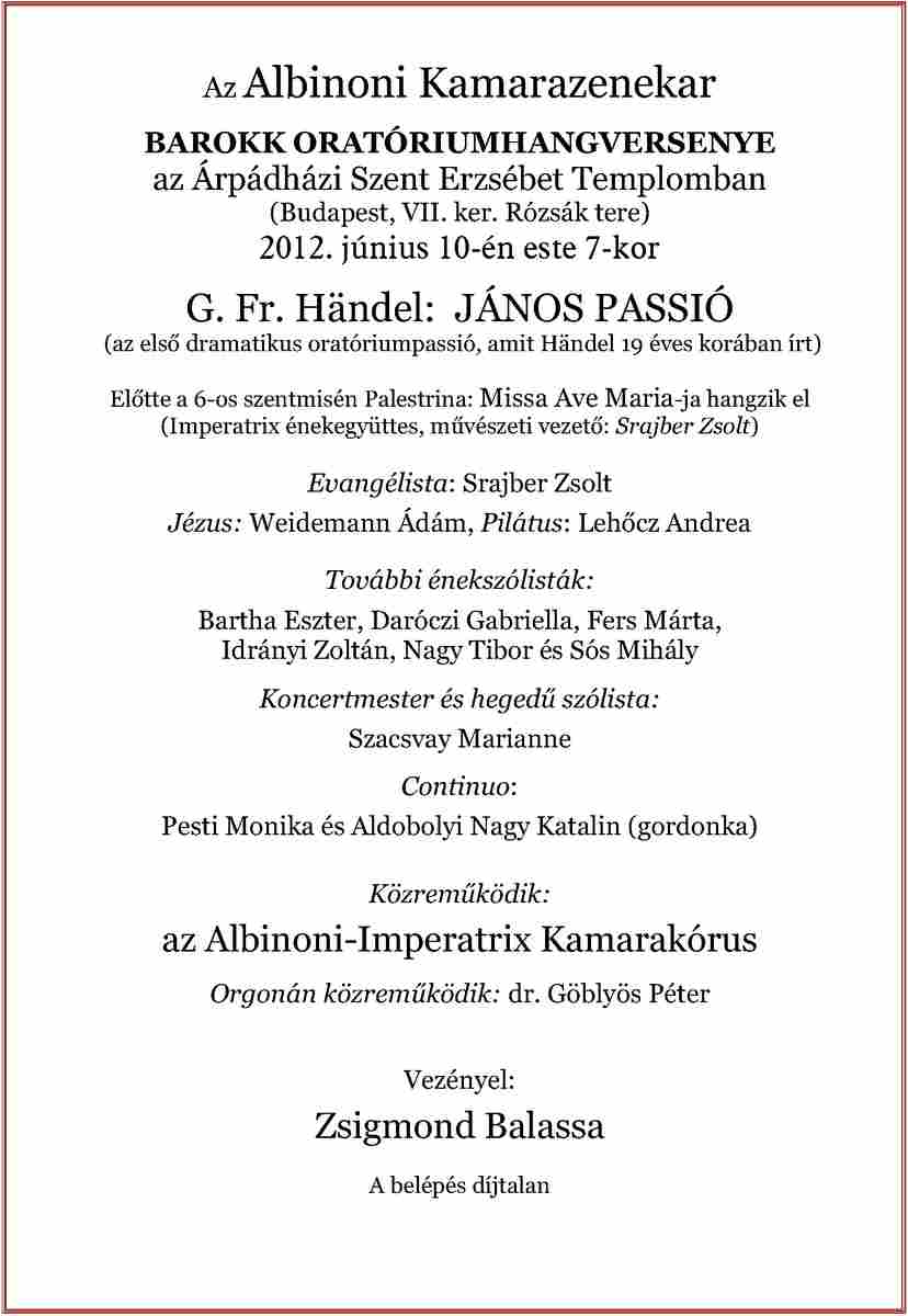 2012. június 10. 19:00 (vasárnap) - Árpádházi Szent Erzsébet templom, VII. kerület, Budapest, Rózsák Tere.