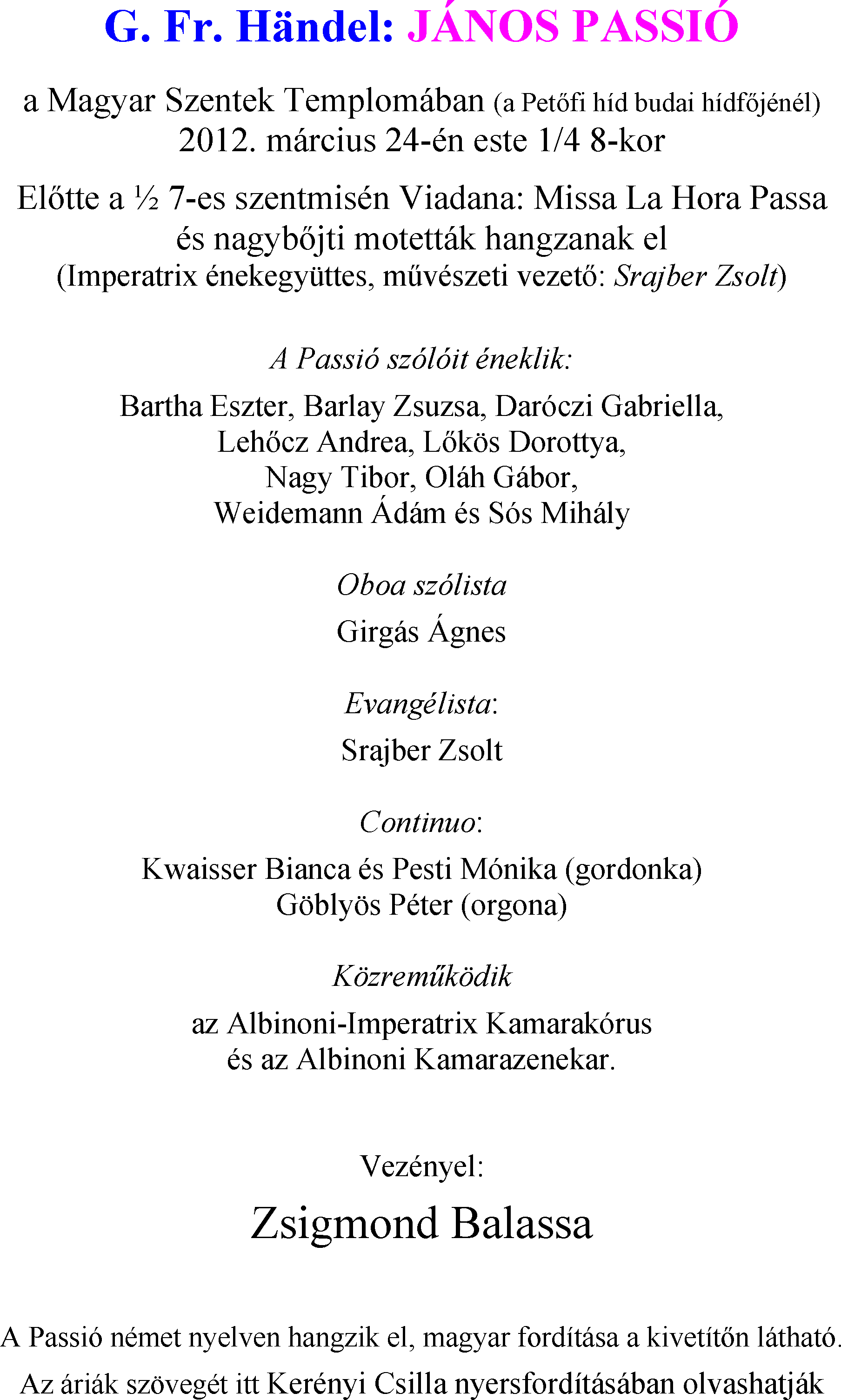 2012. március 24. 19:15 (szombat) - Magyar Szentek Temploma, 1117 Budapest, Magyar Tudósok körútja 1. (Petőfi híd budai hídfőtől délre 150m)