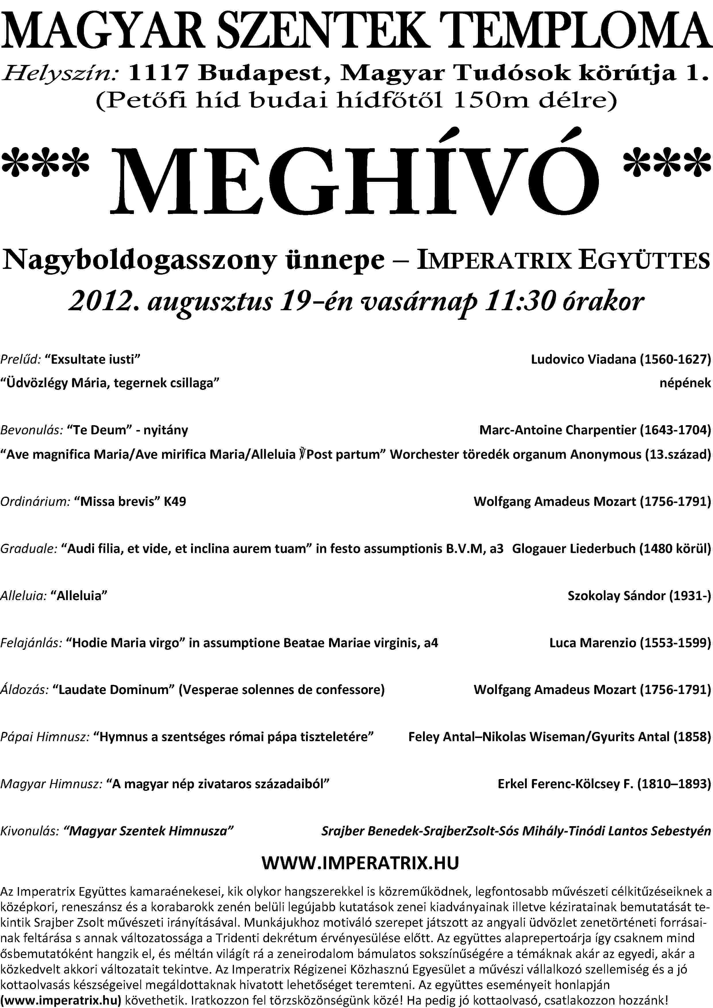 2012. augusztus 19. 11:30 (vasárnap) - Magyar Szentek Temploma, 1117 Budapest, Magyar Tudósok körútja 1. (Petőfi híd budai hídfőtől délre 150m)