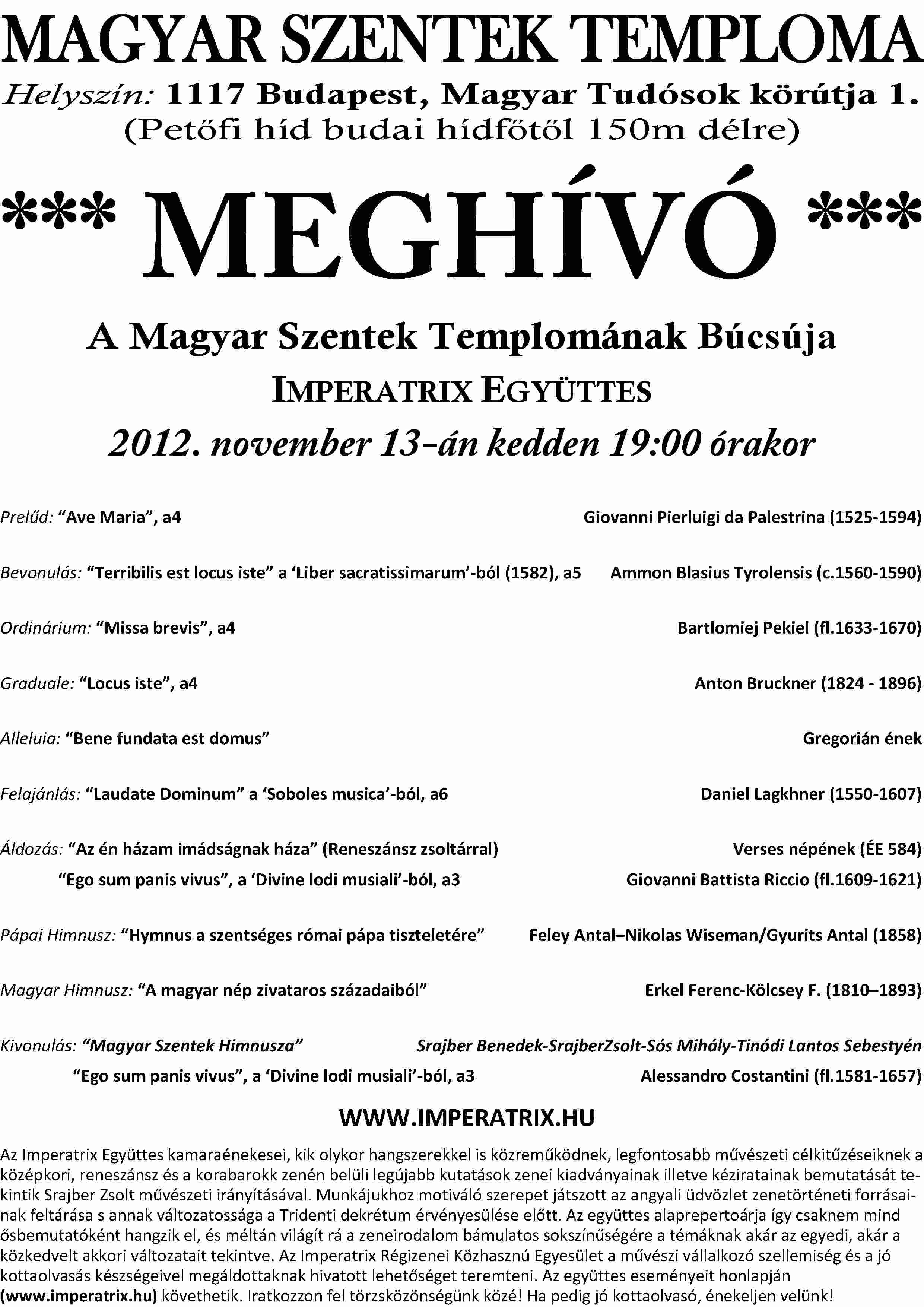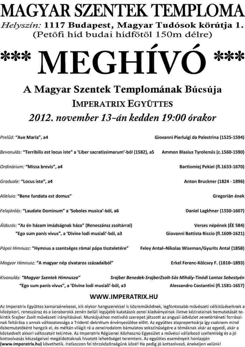 2012. november 13. 19:00 (kedd) - Magyar Szentek Temploma, 1117 Budapest, Magyar Tudósok körútja 1. (Petőfi híd budai hídfőtől délre 150m)