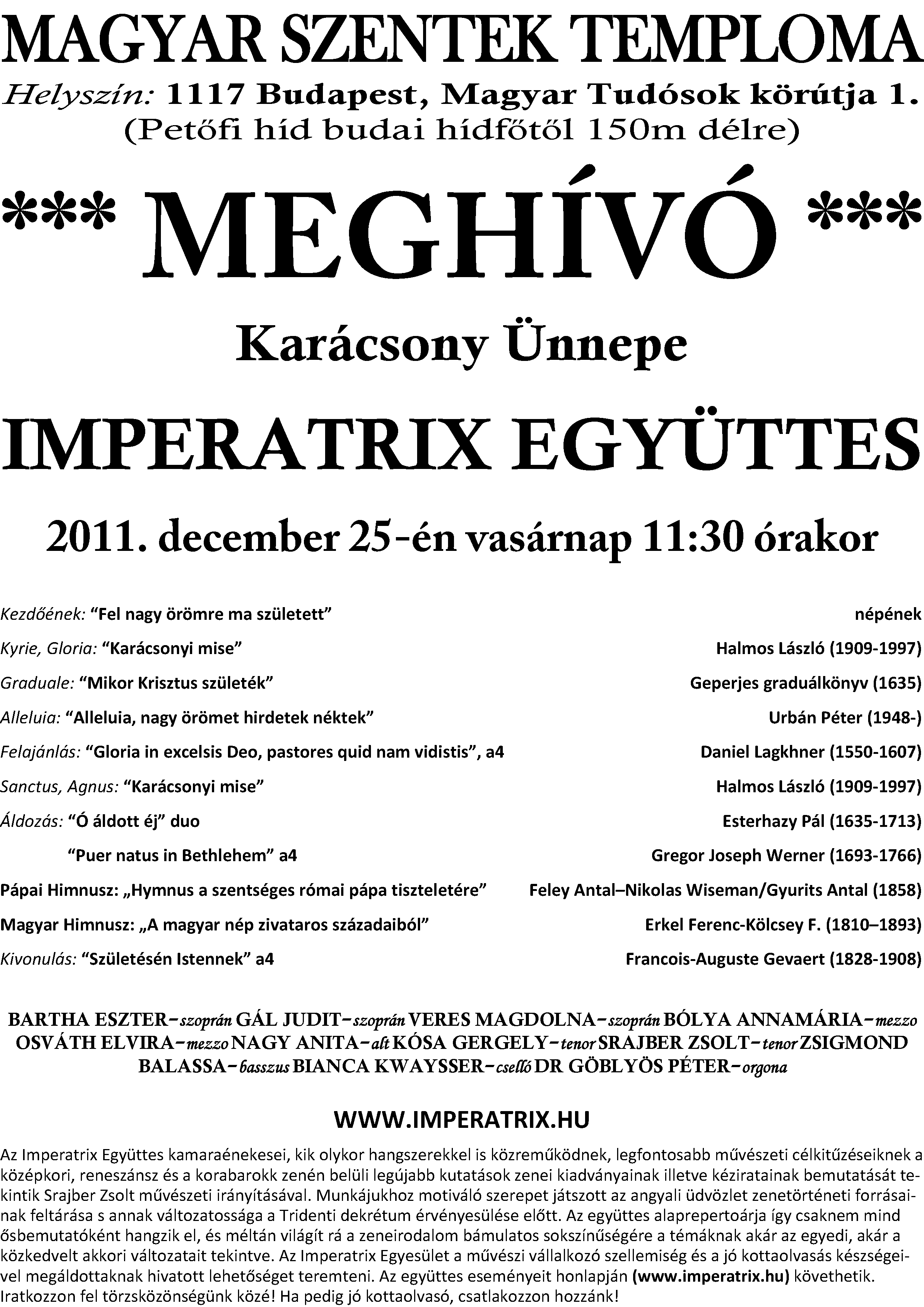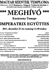 2011. december 25. 11:30 (vasárnap) - Magyar Szentek Temploma, 1117 Budapest, Magyar Tudósok körútja 1. (Petőfi híd budai hídfőtől délre 150m)