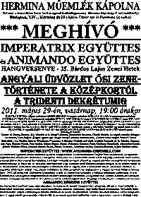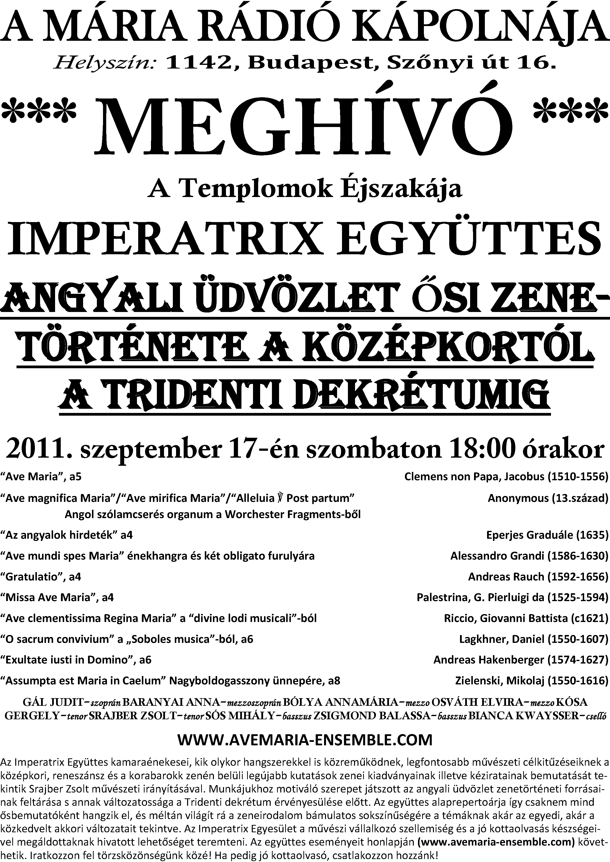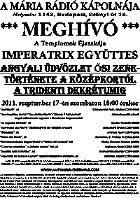 2011. szeptember 17. 18:00 (szombat) - Mária Rádió Kápolnája, 1142 Budapest, Szőnyi út 16.