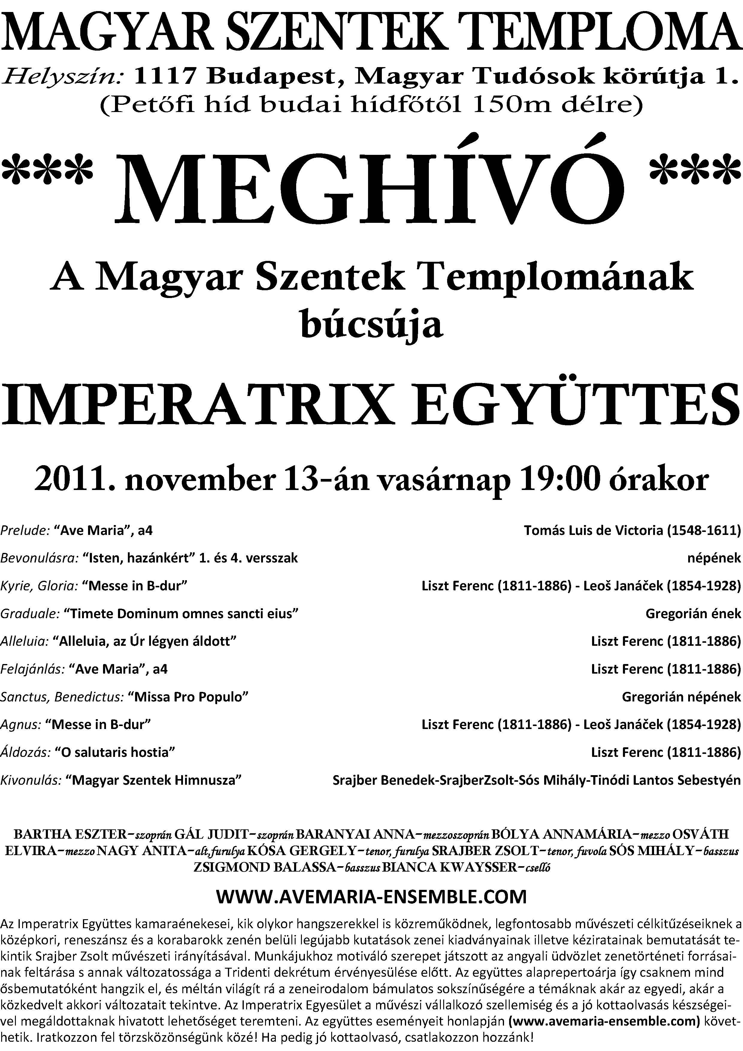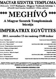 2011. novemeber 13. 19:00 (vasárnap) - Magyar Szentek Temploma, 1117 Budapest, Magyar Tudósok körútja 1. (Petőfi híd budai hídfőtől délre 150m)
