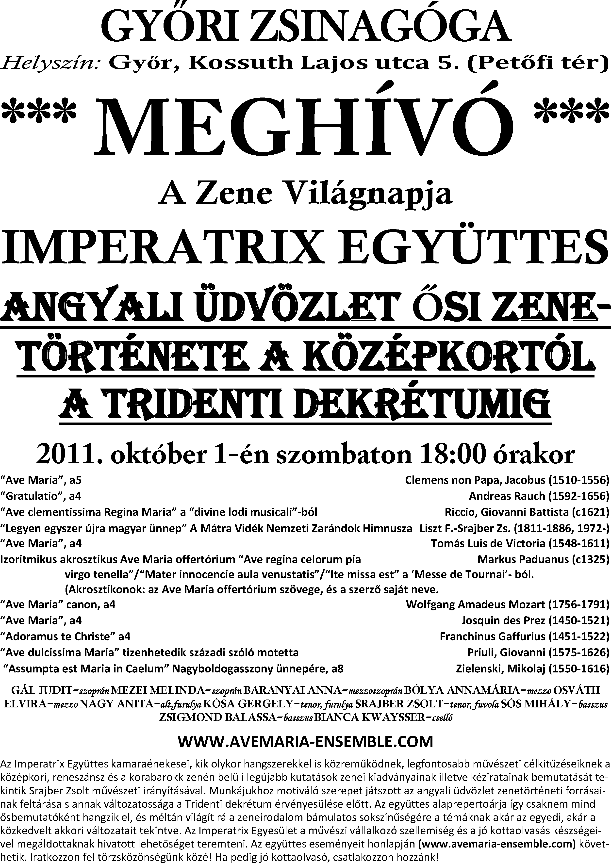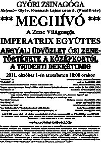 2011. október 1. 18:00 (szombat) - Győri Zsinagóga, 9025 Győr, Kossuth Lajos utca 5. (Újvárosban Petőfi térnél)