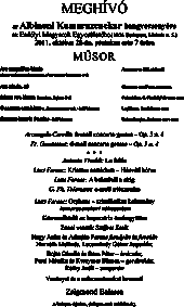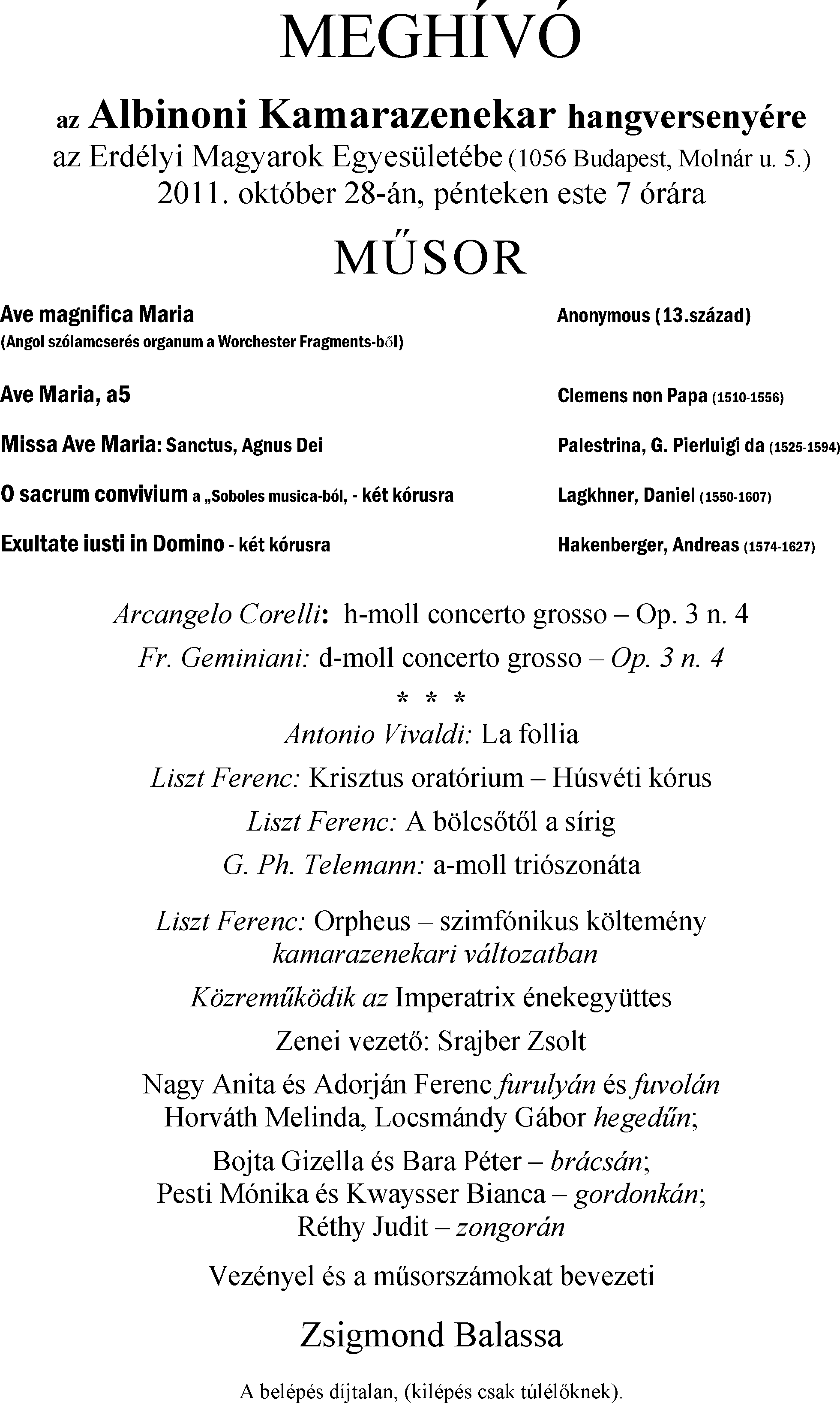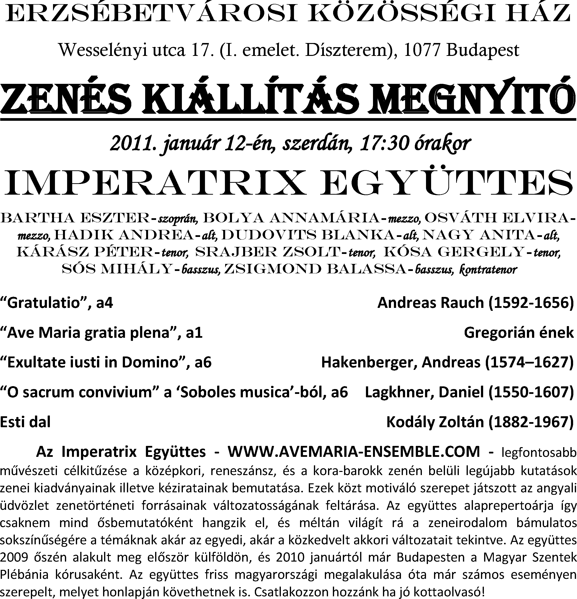 2011. február 26. 19:00 (szombat) - Erzsébetvárosi Közösségi Ház, 1077 Budapest, Wesselényi utca 17, I. emelet Díszterem. (www.kozhaz.hu)