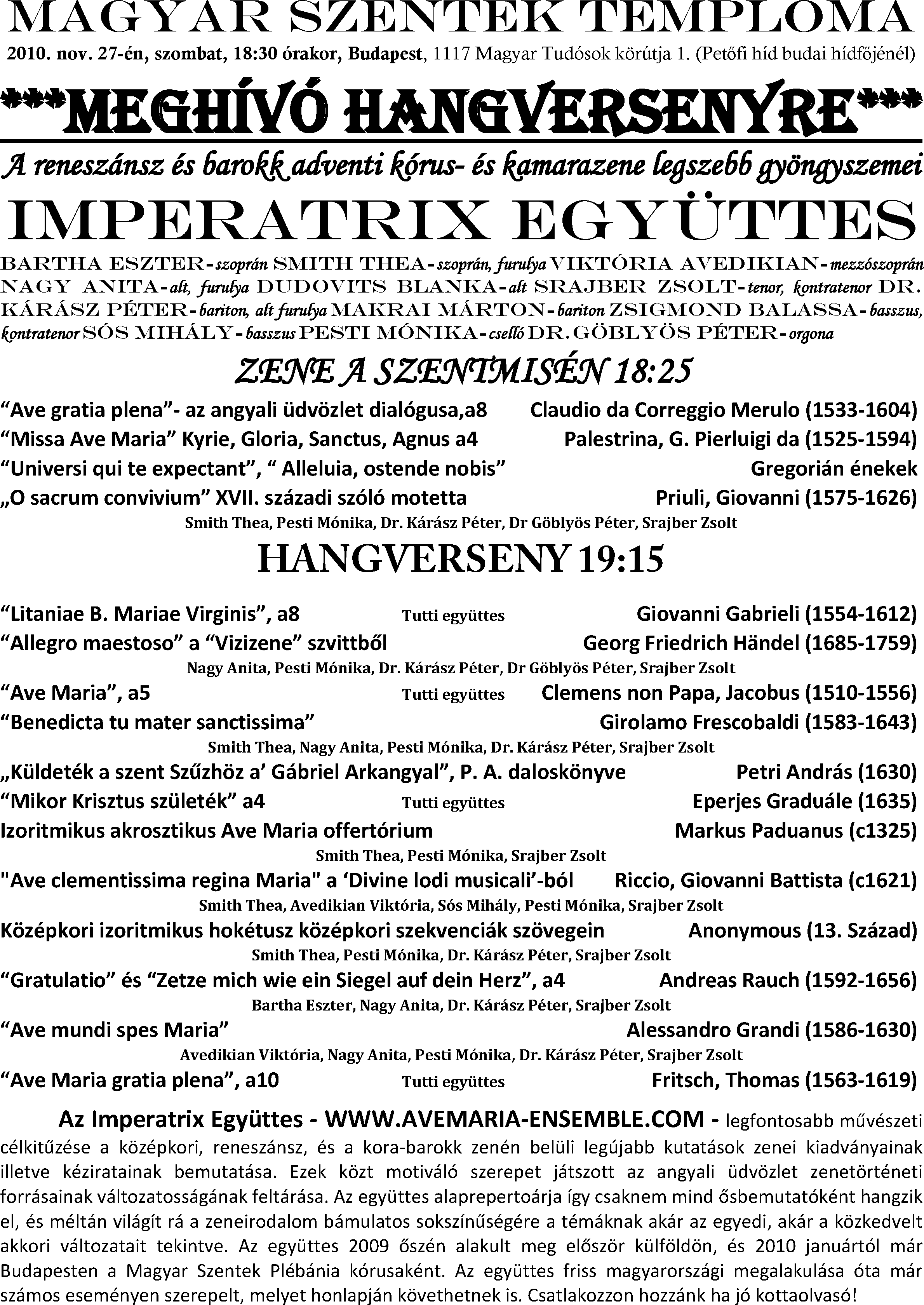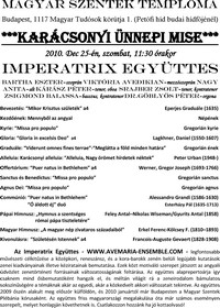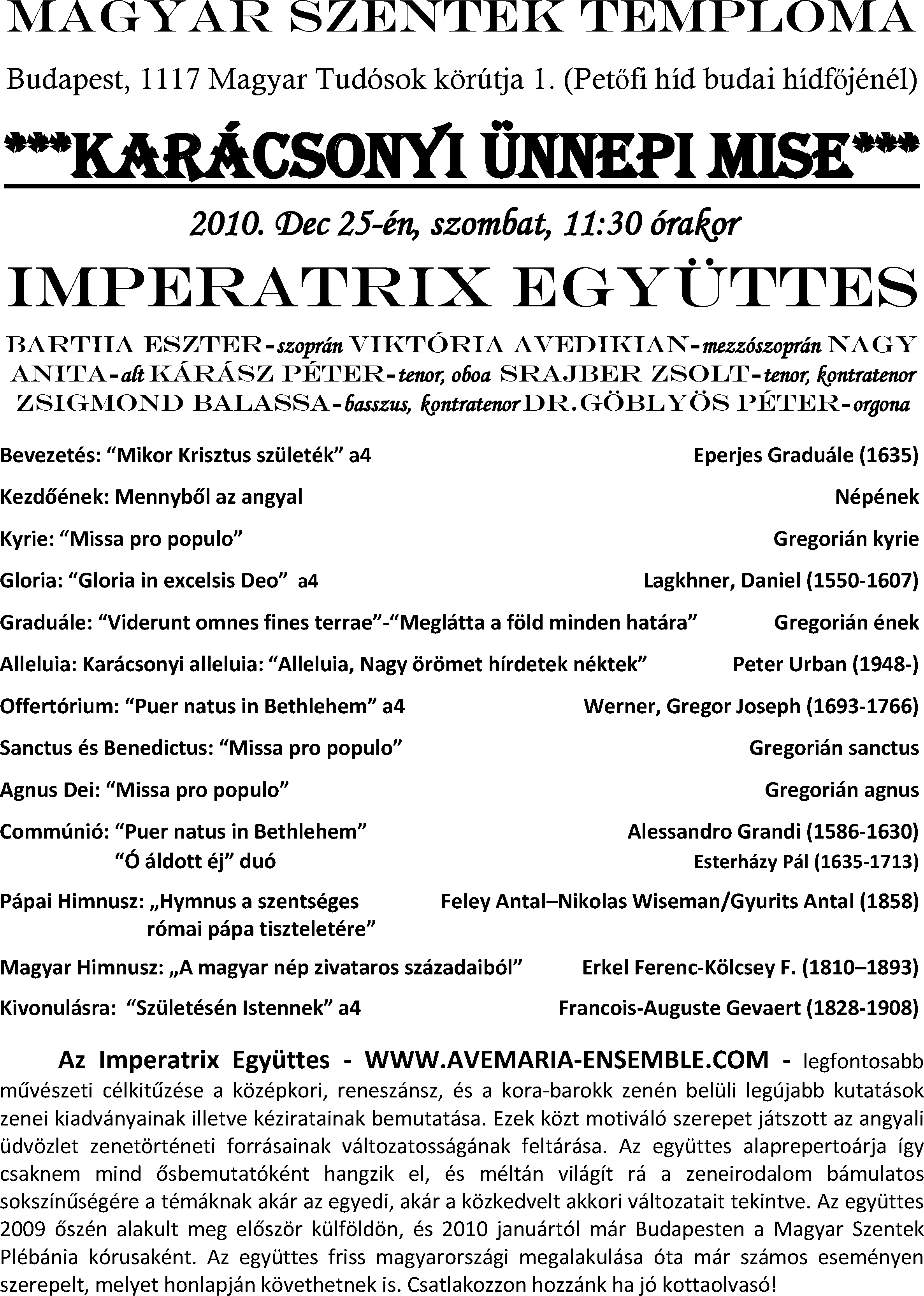 2010. november 27. 18:30 (szombat) - Magyar Szentek Temploma, 1117 Budapest, Magyar Tudósok körútja 1. (Petőfi híd budai hídfőtől délre 150m)