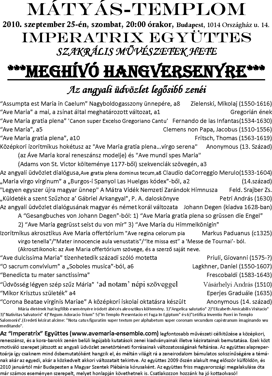 2010. Szeptember 25. 20:00 (szombat) - Mátyás-Templom, 1014 Budapest, Országház utca 14.