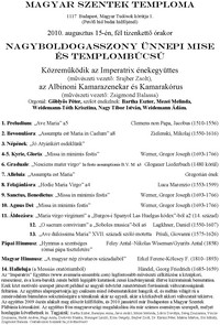 2010. Augusztus 15. 11:30 (vasárnap) - Magyar Szentek Temploma, 1117 Budapest, Magyar Tudósok körútja 1. (Petőfi híd budai hídfőtől délre 150m)