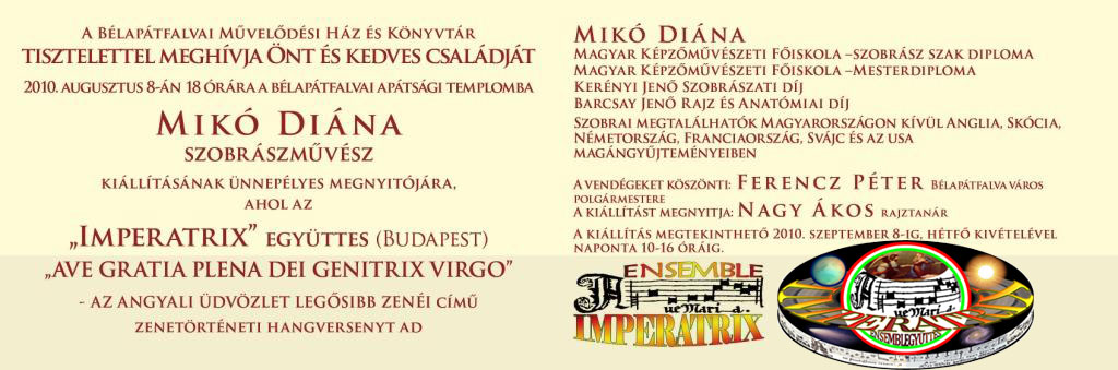 Ünnepélyes nyitó-hangverseny és programzenék a kiállított szobrokhoz Mikó Diána szobrászművész Bélapátfalvai kiállításán.