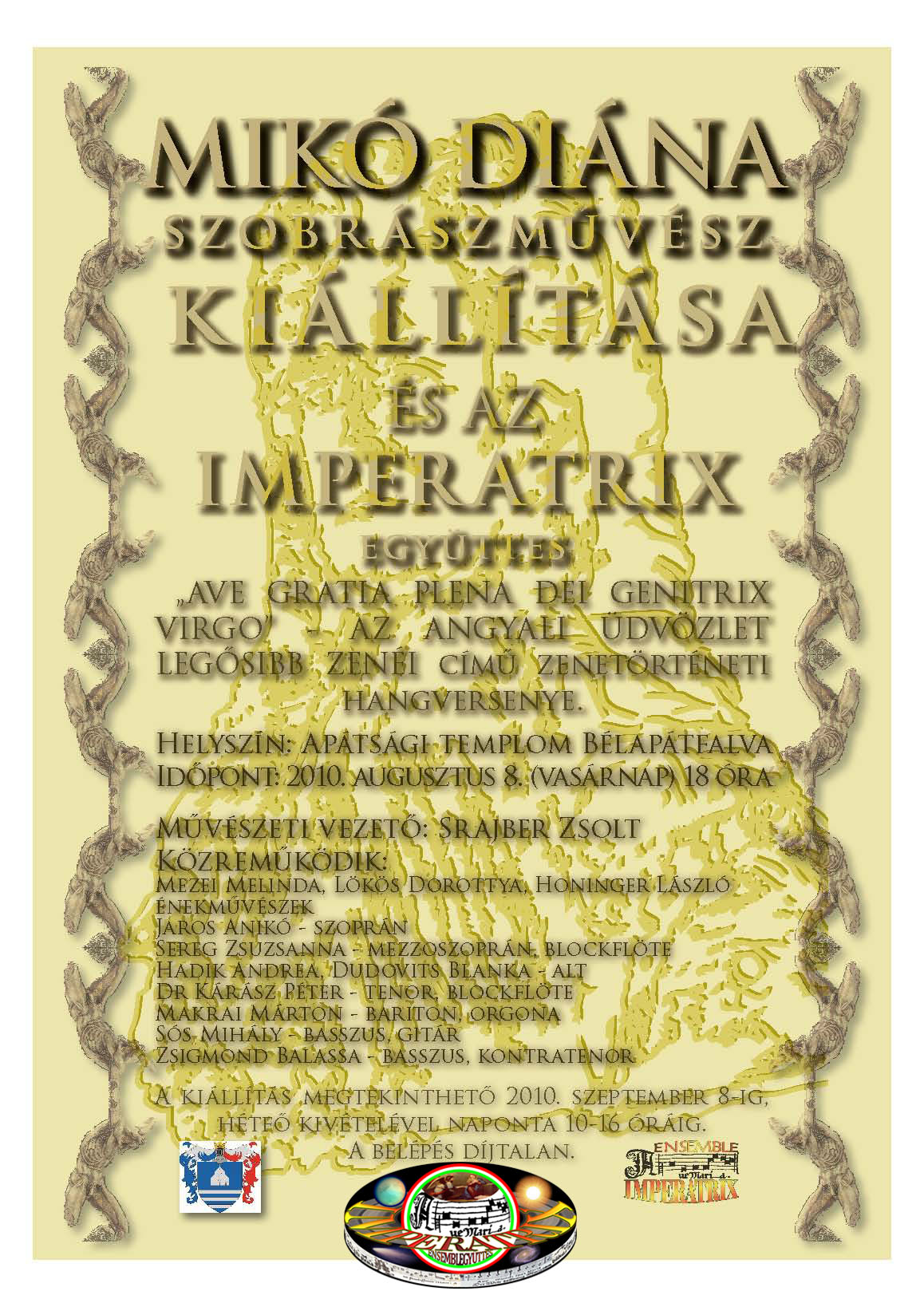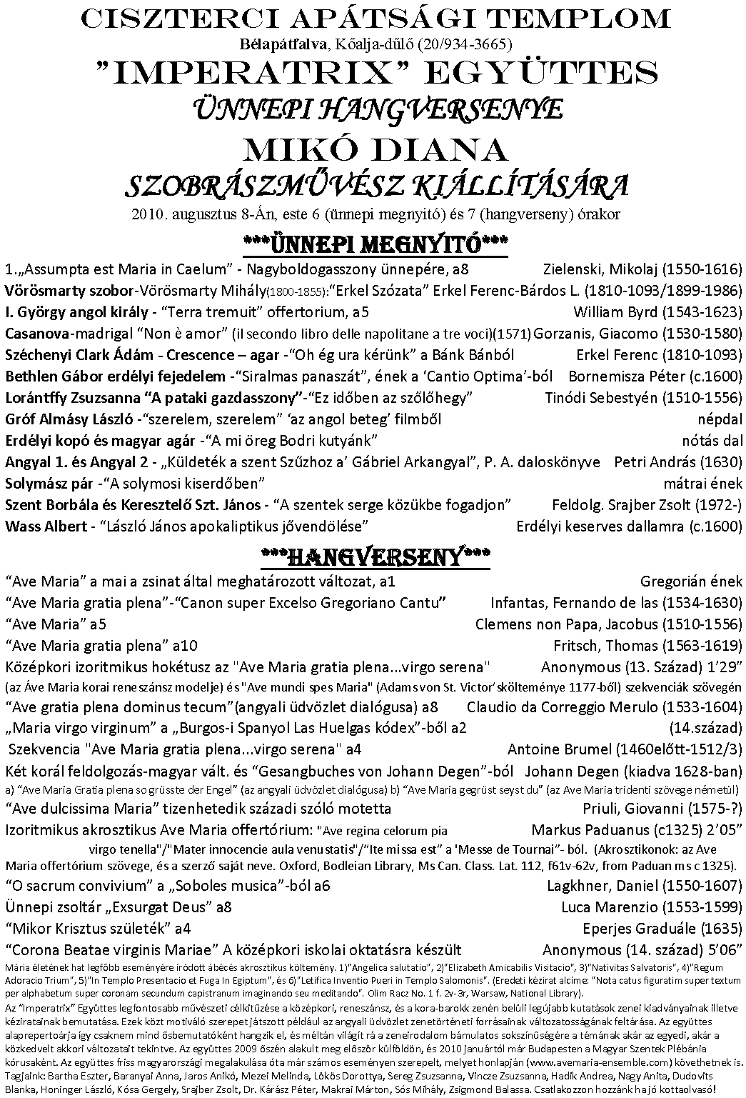 2010. Augusztus 8. 18:00 (vasárnap) - Ciszterci Apátsági Templom, 3346 Bélapátfalva, Kőalja-dűlő. (Tel. 36-20-9343665).