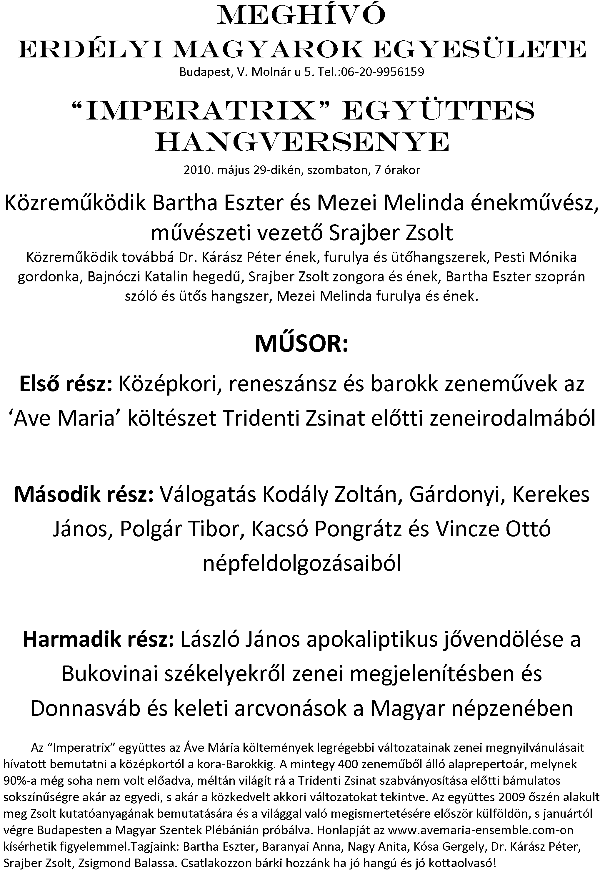 2010. Május 29. 19:00 (szombat) - Erdélyi Magyarok Egyesülete, 1056 Budapest, Molnár utca 5. (Tel. 36-20-9956159, www.erdelyime.org)
