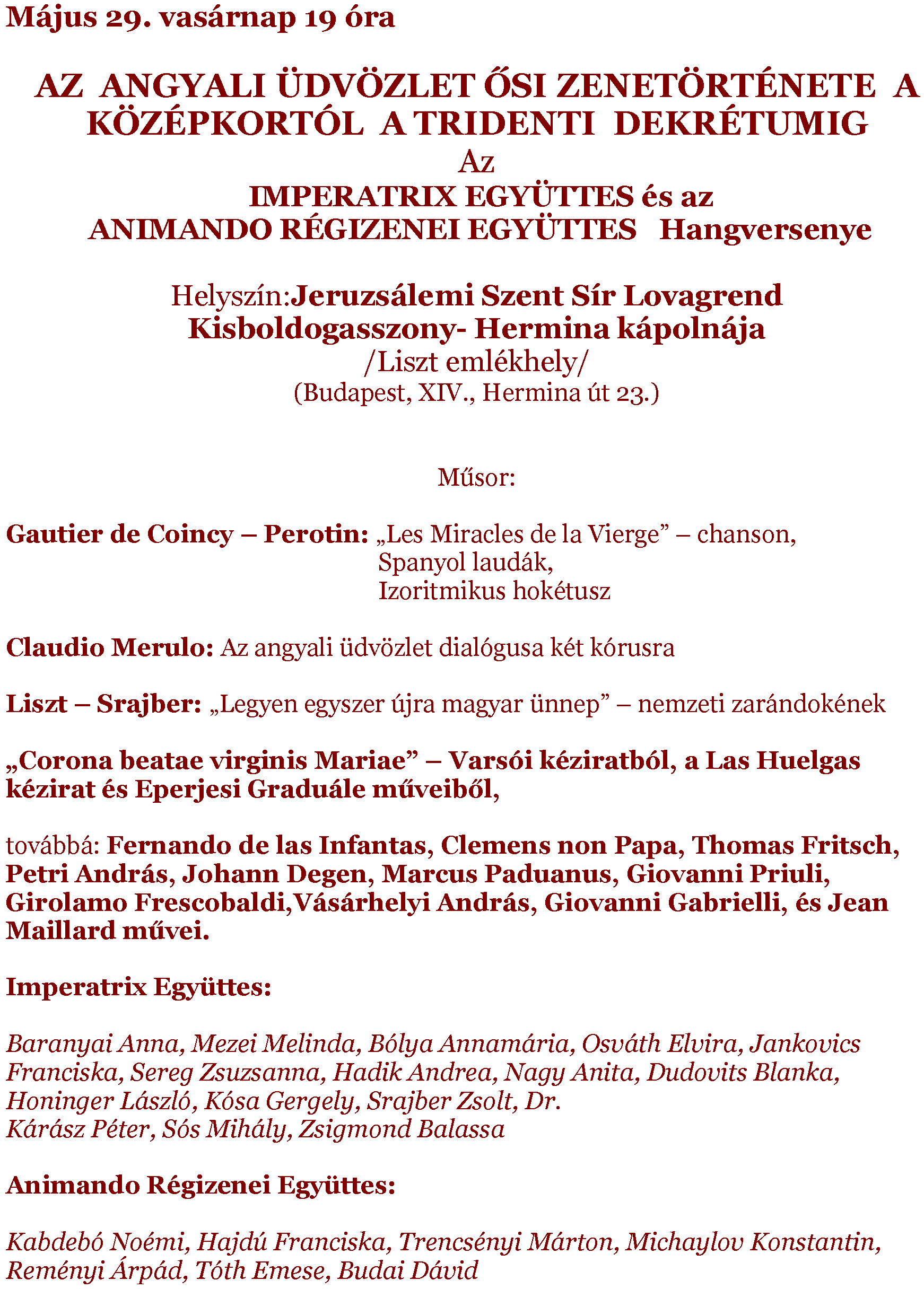 2010. május 29. 19:00 (vasárnap) - "Jeruzsálemi Szent Sír Lovagrend Kis Boldogasszony Neogótikus Műemlék Kápolnája”, XIV. kerület, Budapest, Hermina út 23.