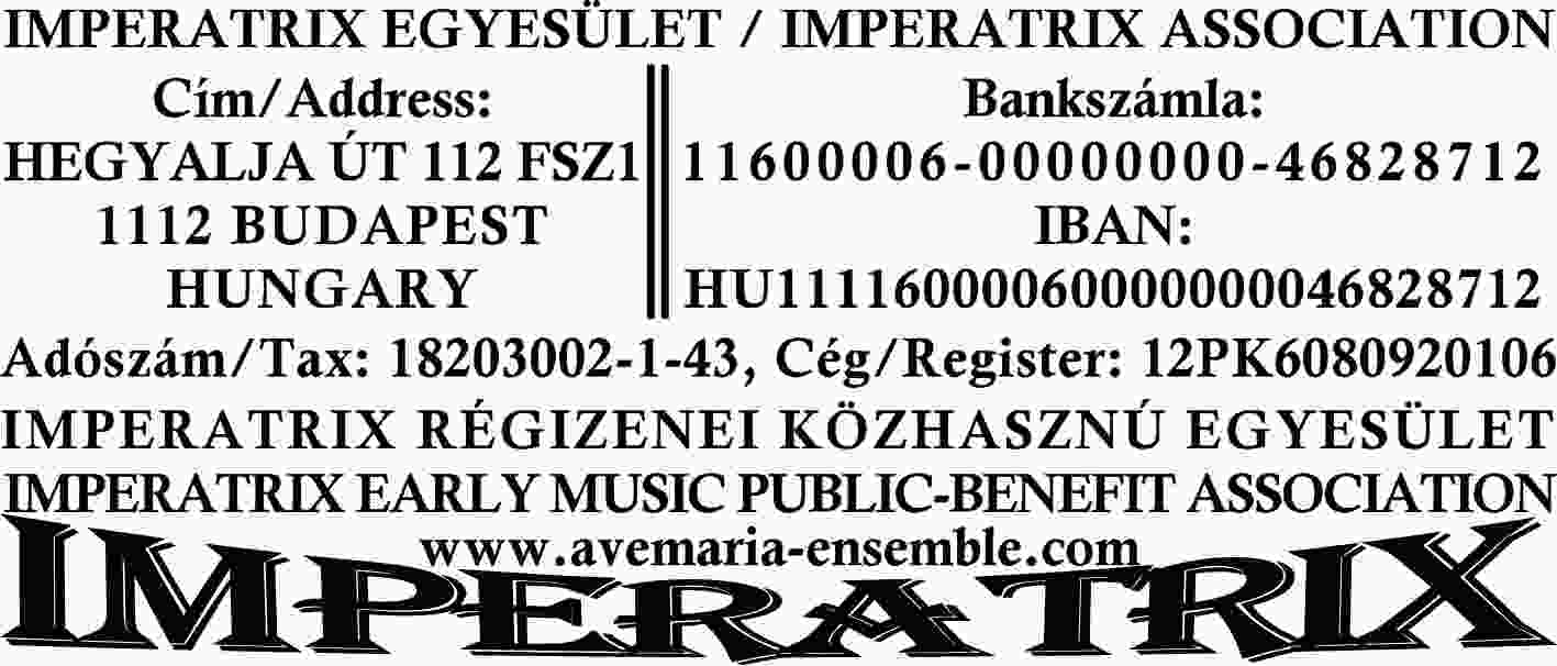 IMPERATRIX EARLY MUSIC ASSOCIATION E-mail: Cég / Register:12PK6080920106 Adószám / Tax:18203002-1-43 Bank számlaszám / Bank account:HU11116000060000000046828712
