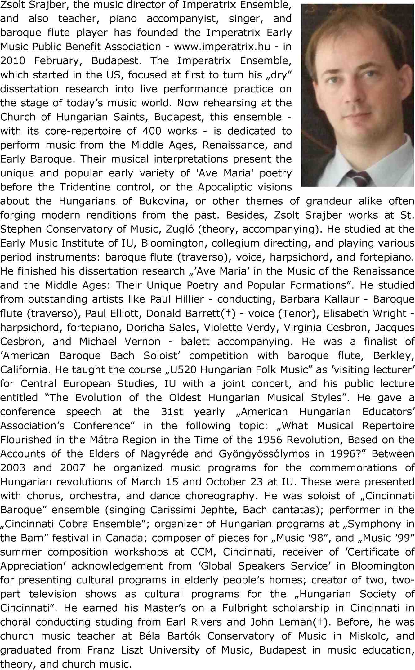 Resume of Zsolt Srajber Zsolt Srajber - personal contact: Phone EU: 36-30-7695432 (cell) Phone US: 812-669-0353 (US) Skype: zsolt7777777 Email: zsrajber@gmail.com Websites: http://www.imperatrix.hu http://www.youtube.com/zsoltmusic Address: Hegyalja út 112, Fszt. 1. H-1112, Budapest, Hungary